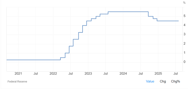As you probably know, interest rates (i.e., the cost of capital) have risen —almost doubled over the last several years. Below is a snapshot of the Federal Funds rate over the last five years.